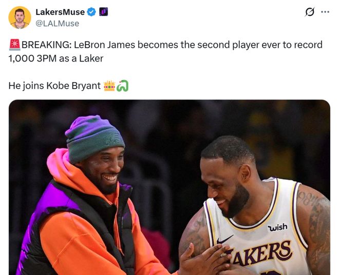 凭借这样的表现,詹姆斯成为湖人队史第二位命中至少1000记三分的球员,第一位是科比1827记。