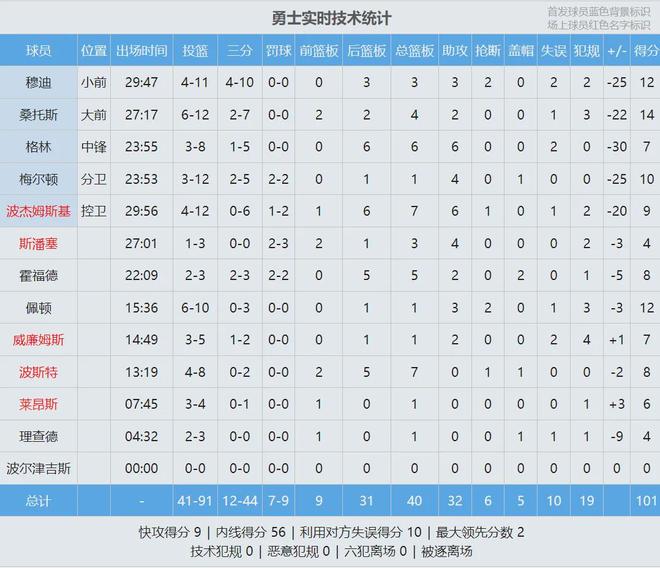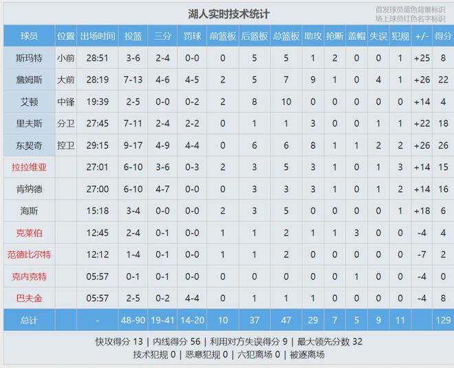 詹姆斯火力全开,第二节6投5中单节轰下14分。上半场詹姆斯10投7中,砍下20分4板4助1断,正负值+20。湖人全队三分球17中9,勇士只有24中5。小佩顿8投5中砍下10分,得分全队最高。追梦3中1怒砍2分,正负值-20两队最低。