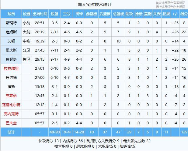 湖人队:东契奇26分6板8助、詹姆斯22分7板9助、里夫斯18分1板3助、肯纳德16分3板3助、拉拉维亚15分5板3助、斯玛特8分5板1助2断、巴夫金8分1助、海斯6分5板、艾顿4分10板