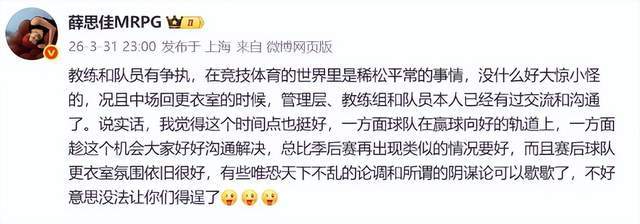 赛后,上海媒体人薛思佳在社交平台发声,主动为上海男篮开脱,开起来说得很有道理的样子,透露双方已经和解,更衣室氛围很好,云云。至于说,是不是真的和好了,接下来的比赛,将会见分晓。一旦上海男篮失去了洛夫顿,想要冲击总冠军,难度值可不小哦,各位觉得呢?