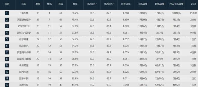 最后看看最新的排名,前四名变成上海队(30-4)、广厦队(27-7)、广东队(23-11)和深圳队(23-11),具体如下: