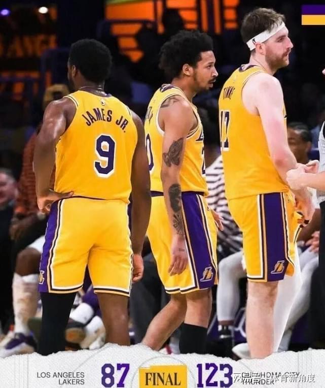 下半场“湖三崩”准时上演,单节15分,被雷霆按在地上摩擦,分差直接飙到31分,这剧情比坐过山车还刺激。要说全场唯一能让人回味的,大概就是布朗尼反击时那记单臂飞扣——那动作,那气势,仿佛在说:“就算爹地输球,儿子也要当最靓的崽!”而雷霆那边,鸭梨(亚历山大)大佬在锁定胜局后,提前打卡下班,连续139场20+,这数据比我的游戏连胜纪录还夸张。最终雷霆123-87血洗残阵湖人,赛季四杀,四场累计赢117分,这数字听着像湖人给雷霆发了个“大红包”。