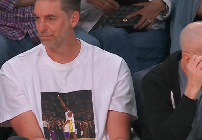 细节满满!加索尔身穿印有科比海报的T恤场边观战