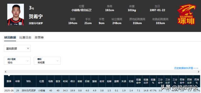 本场比赛,贺希宁出战37分47秒,19投9中,三分10中4,罚球9罚8中,得到30分3篮板6助攻2抢断,攻守两端存在感拉满的同时。