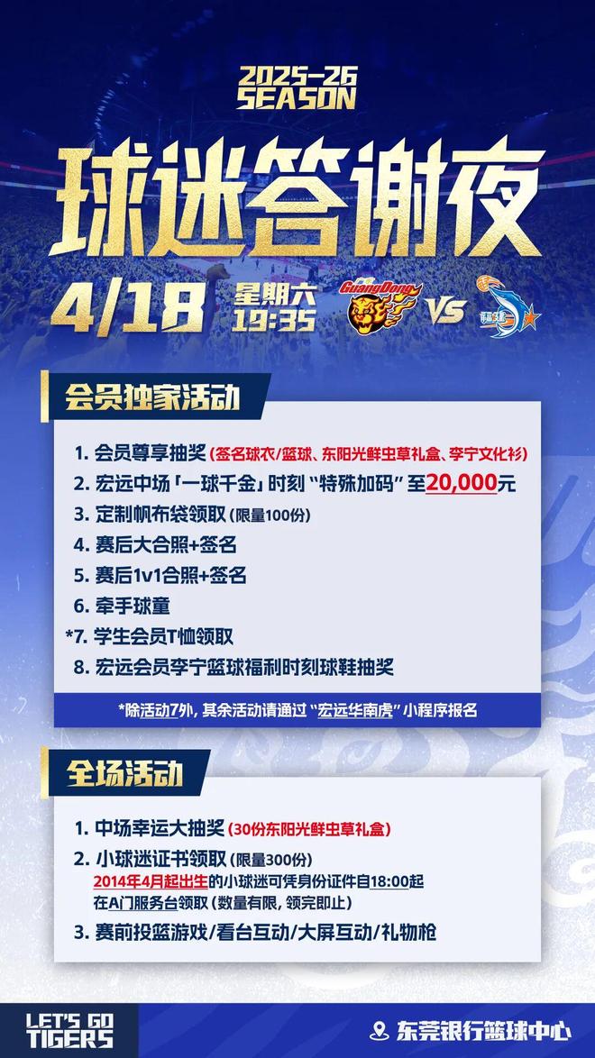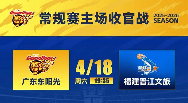4月18日,CBA常规赛第40轮,广东东阳光将迎来本赛季常规赛主场收官战,对手为福建晋江文旅男篮。上赛季2次交锋,华南虎保持全胜。